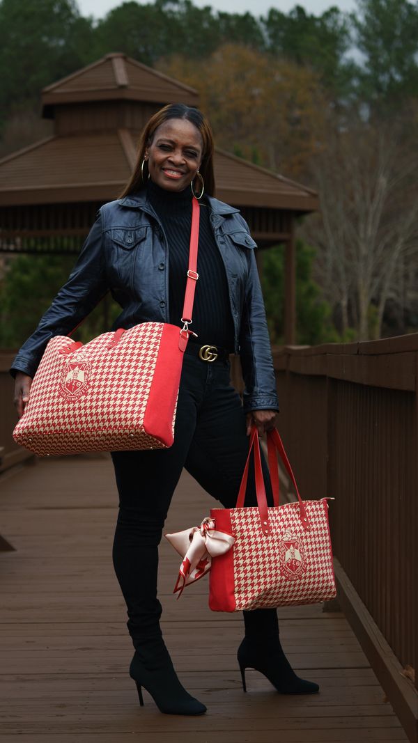Our Beautifully handcrafted Houndstooth travel bags are available for purchase. The set includes 2 travel bags and purse/neck scarfs and ships for FREE. Click on the button below to place your order.